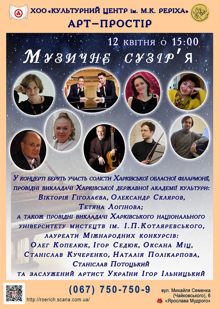 12 квітня 2025 р. в Арт-Просторі Харківського Культурного Центру імені М.К. Реріха відбувся концерт «Музичне сузір’я», який був присвячений 90-річчю з дня підписання Пакту Реріха 15 квітня 1935 року та Міжнародному Дню Культури. У концерті взяли участь видатні харківські музиканти та співаки. Глядачі тепло приймали кожного виконавця. Концерт проходив серед живописних робіт Харківської художниці Людмили Горбатенко... Детальніше...