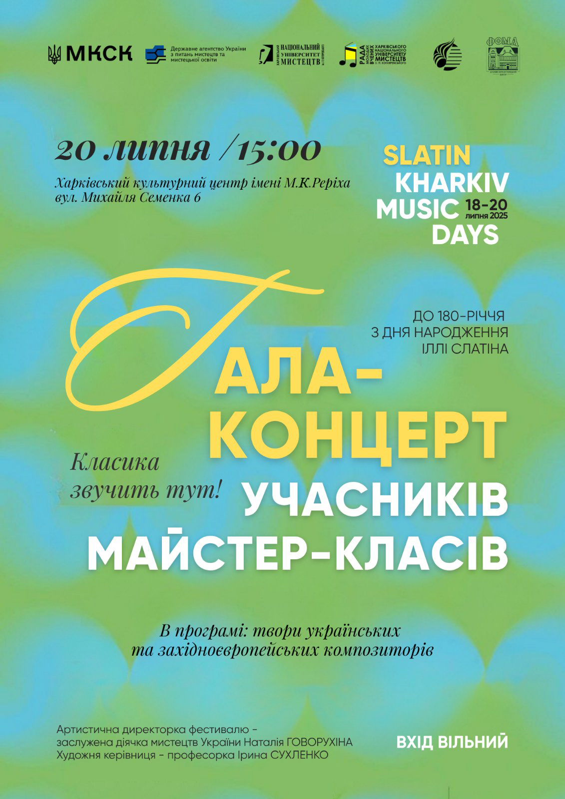 20 липня 2025 р. в Арт-Просторі Харківського Культурного Центру імені М.К. Реріха відбувся Гала-концерт учасників майстер-класів в межах Літнього музичного фестивалю "SLATIN KHARKIV MUSIC DAYS" (до 180-річчя з Дня народження Іллі Слатіна). Детальніше...