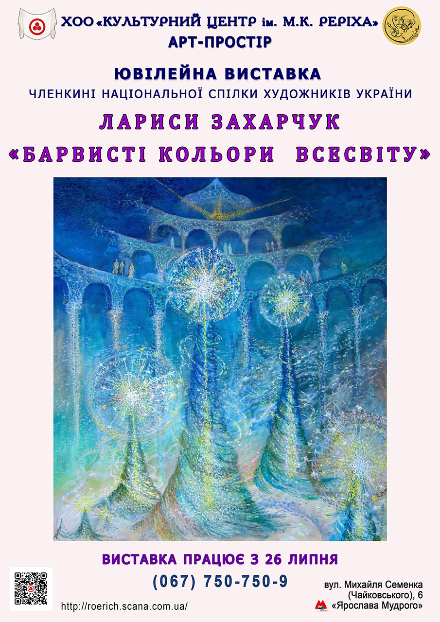26 липня о 14:00 запрошуємо до Арт-Простору Харківського Культурного Центру імені М.К. Реріха на відкриття ювілейної виставки талановитої харківської художниці, членкині Національної спілки художників України Лариси Захарчук «Барвисті кольори Всесвіту». В експозиції представлені 24 картини, що відображають її багаторічний творчий шлях у мистецтві. Вона, єдина в Україні художниця, яка працює в унікальній старовинній техніці - «фунтик». На презентації виставки ви зможете познайомитись з новим напрямком у сучасному мистецтві, який називається космізмом, та взяти участь в авторській екскурсії по виставці.