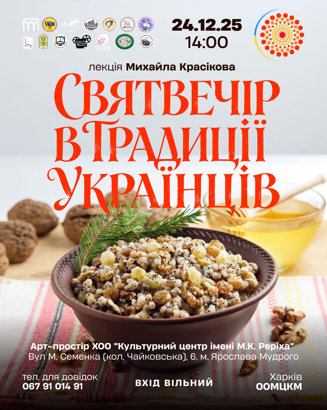 24 грудня о 14:00 відбудеться лекція етнолога та фольклориста, професора Михайла Красікова “Святвечір в традиції українців”. Запрошуємо вас до Арт-простору Харківського Культурного Центру ім. М.К. Реріха за адресою: вул. М. Семенка (Чайковська), 6. Метро “Ярослава Мудрого”. Детальніше...
