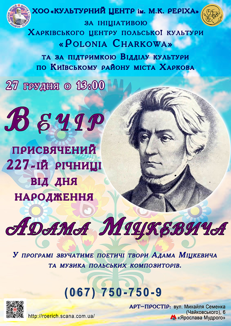 27 грудня 2025 р. за ініціативи Харківського товариства польської культури «Полонія Харкова» та за підтримки Відділу культури по Київському району м. Харкова в Культурному Центрі ім. М.К. Реріха відбувся захід, присвячений польському поету європейського романтизму Адаму Міцкевичу Детальніше...