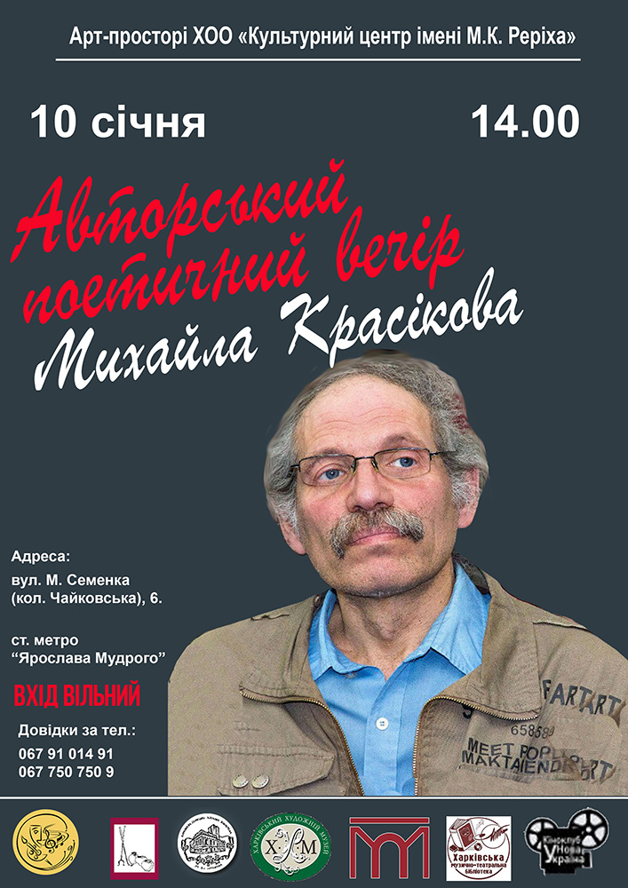 10.01.26 о 14.00 в Арт-просторі ХОО «Культурний центр імені М.К. Реріха» відбудеться авторський поетичний вечір Михайла Красікова. Детальніше...